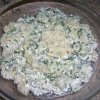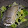 3, A tetejére morzsolom a lecsepegtetett tonhal konzervet és rászórom a fekete olajbogyókat.